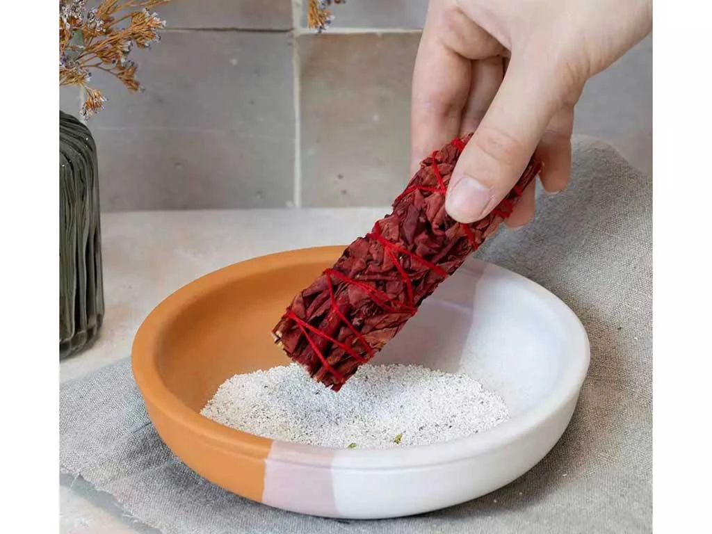 Allumez la tresse de sauge Sang-Dragon. Une fois l’extrémité de la tresse enflammée, soufflez la flamme. Déposez la dans une coupelle résistante à la chaleur.
